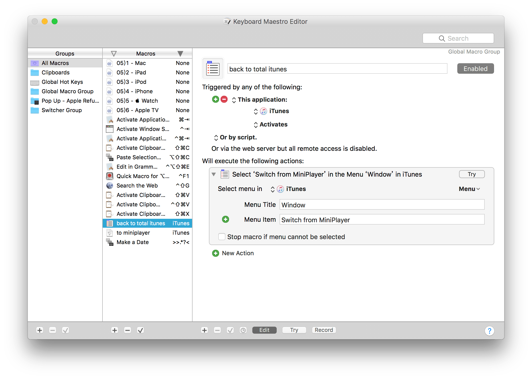 用 Keyboard Maestro 配合 AppleScript 就可以实现上面这种自动化功能,我们先说从主窗口自动切换到 MiniPlayer,新建一个 Marco,命名,在 Trigger 里选择「This application」,状态选「Deactivates」,然后执行 action 里选择「Execute AS」,输入下面这段命令: