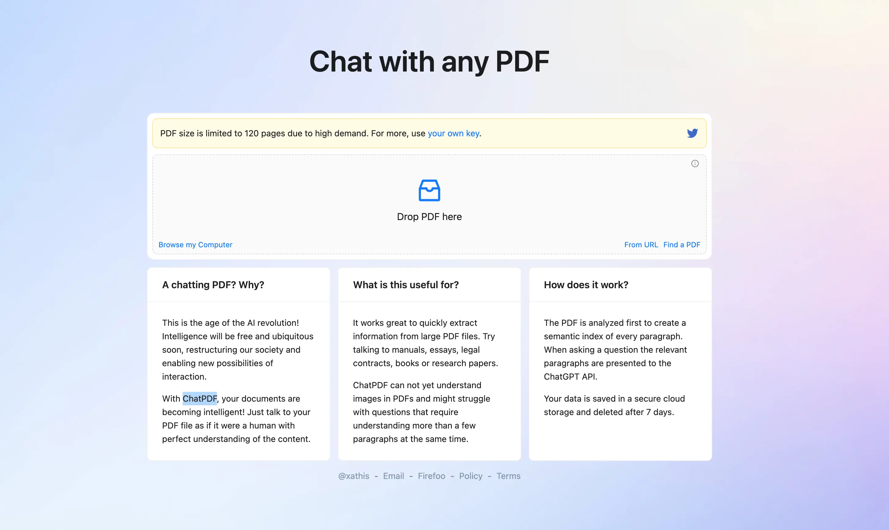 ChatGPT 最近火的不得了,在其开放了 API 后,围绕其推出的各类应用已经爆炸式的布满了我的整个 twitter timeline,除了那个可以自动翻译外文小说的奇异 Python 脚本外,就是本页的主角了 ChatPDF。 ChatPDF 是一个 web 应用,只需要上传你要阅读的 PDF ...